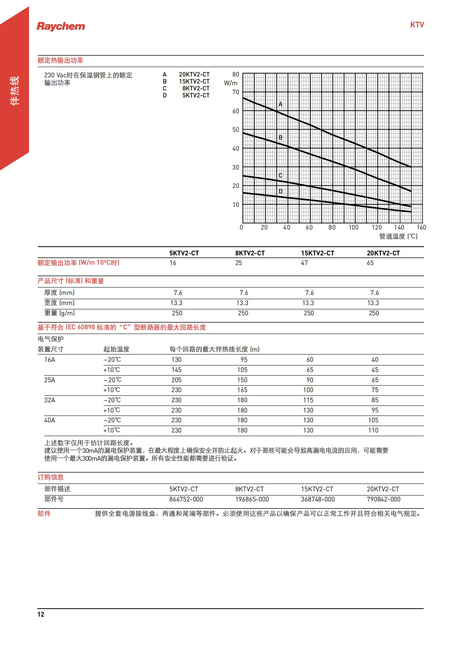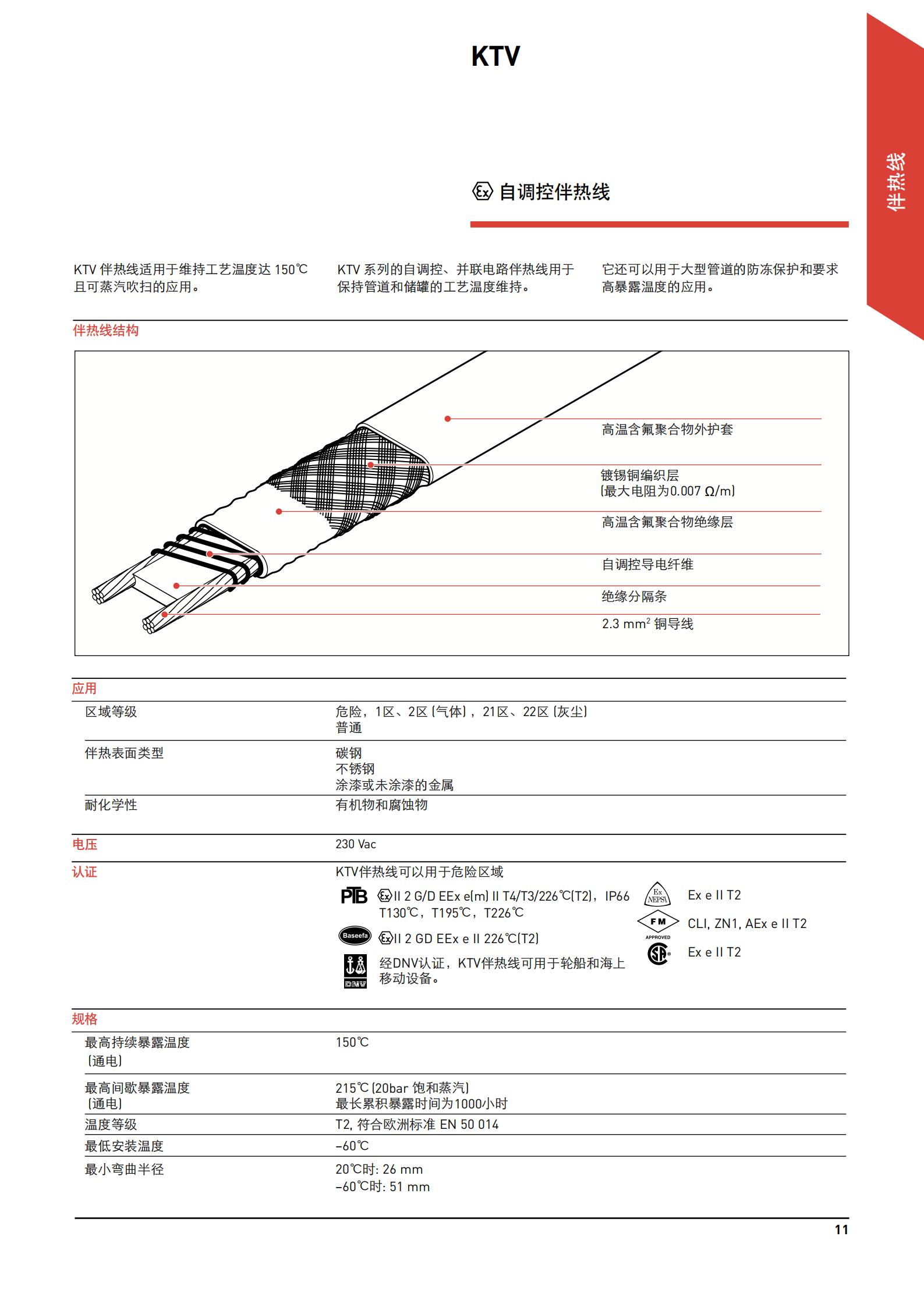 KTV系列自调控电伴热线型号有:20KTV2-CT、15KTV2-CT、8KTV2-CT、5KTV2-CT。 KTV伴热线适用于维持工艺温度达 150℃且可蒸汽吹扫的应用。KTV 系列的自调控、并联电路伴热线用于保持管道和储罐的工艺温度维持。它还可以用于大型管道的防冻保护和要求高暴露温度的应用。