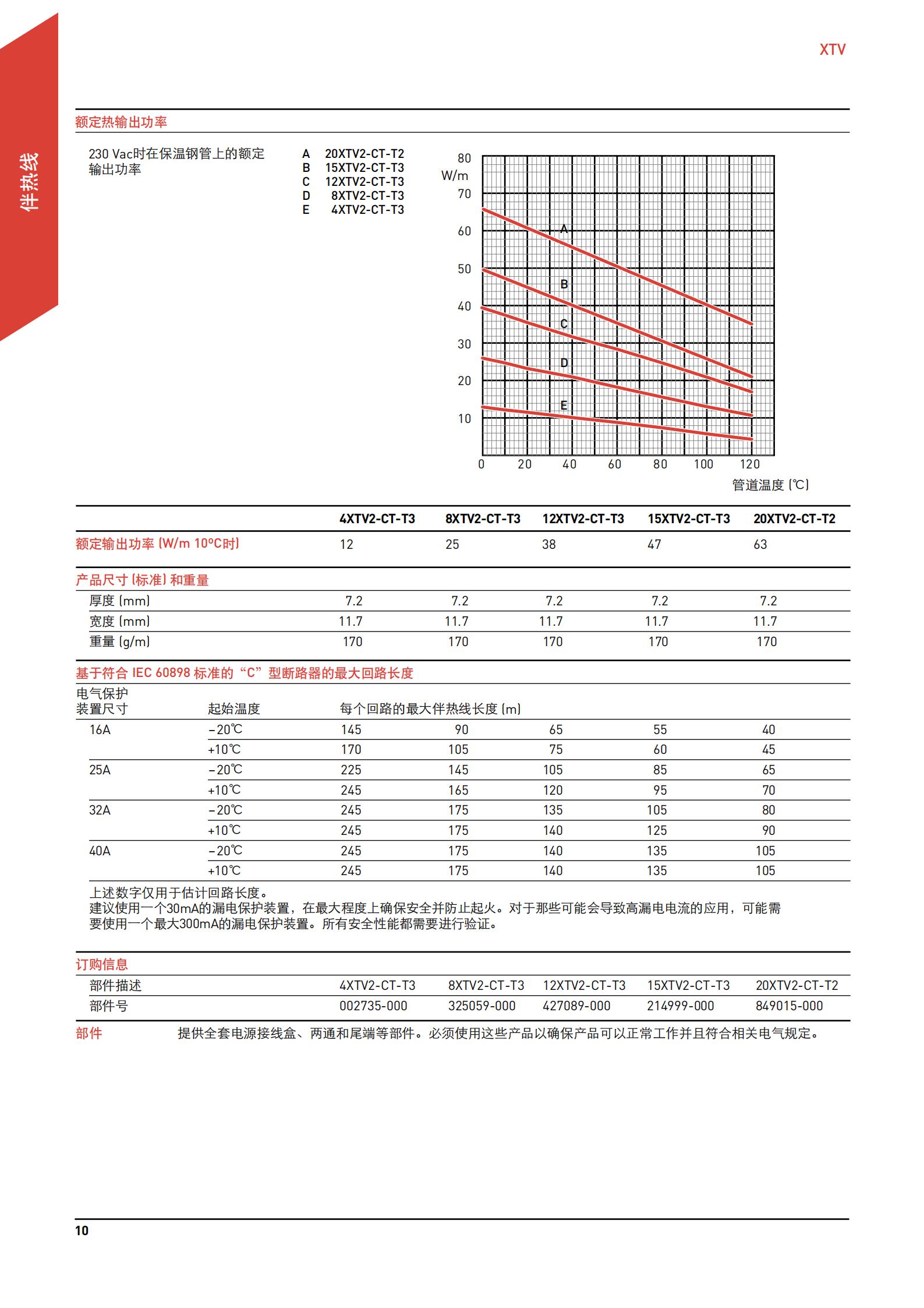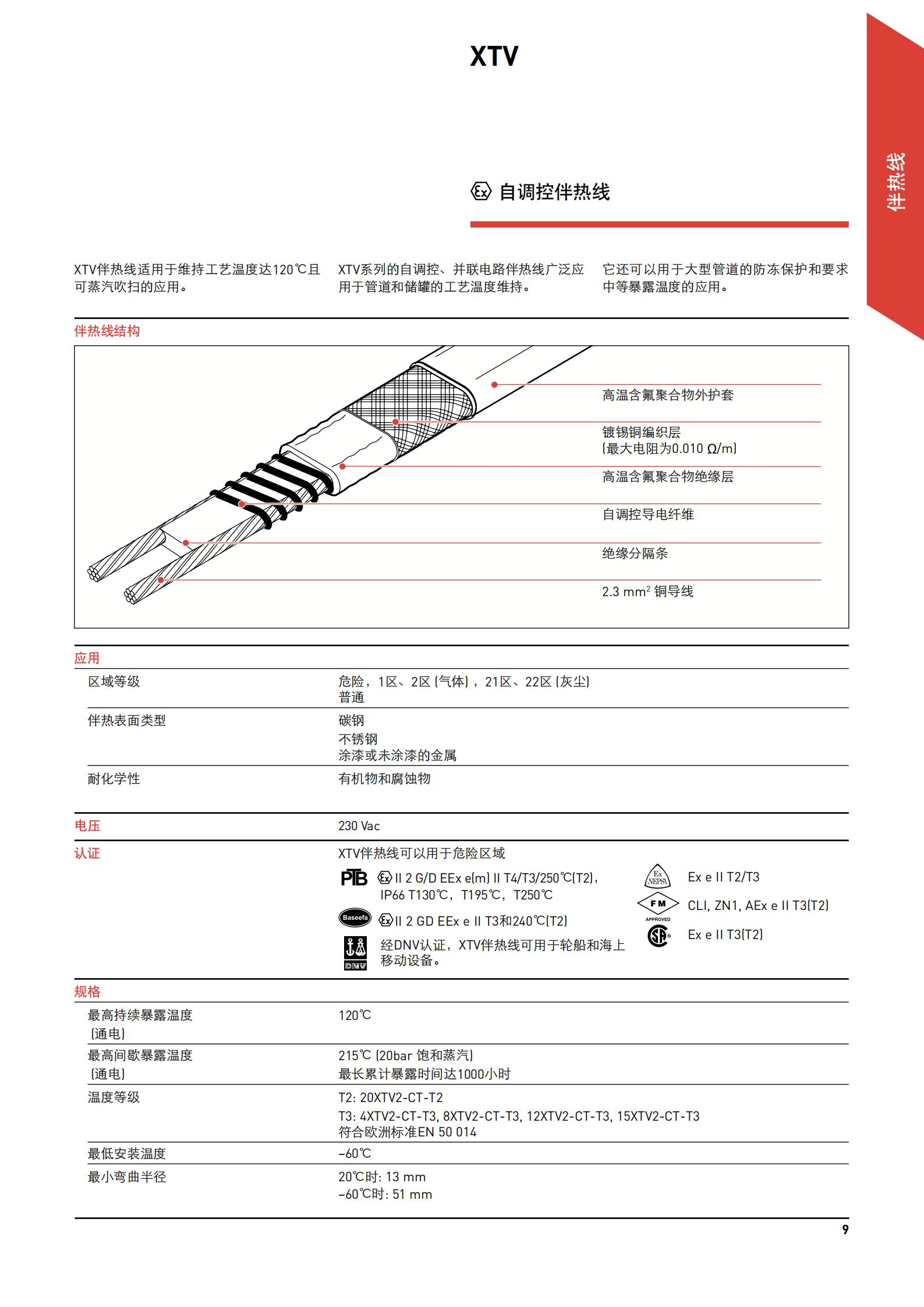 XTV系列自调控电伴热线型号有:20XTV2-CT、15XTV2-CT、12XTV2-CT、8XTV2-CT、4XTV2-CT。XTV伴热线适用于维持工艺温度达120℃且可蒸汽吹扫的应用。XTV系列的自调控、并联电路伴热线广泛应用于管道和储罐的工艺温度维持。它还可以用于大型管道的防冻保护和要求中等暴露温度的应用。